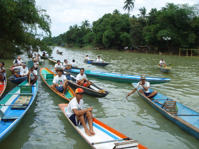 필리핀 모국어 따갈로어로 '방카' 라고 불리는 작은쪽배에 2명씩 태우고 앞,뒷 2명에 현지민이